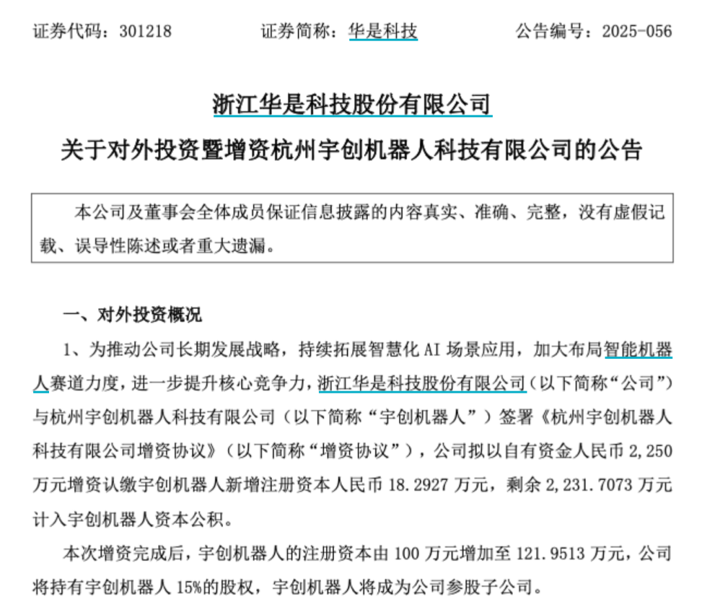 值得一提的是,就在2个月前,华是科技发布公告称,宣布以自有资金2250万元增资杭州宇创机器人科技有限公司,获得其15%的股权。