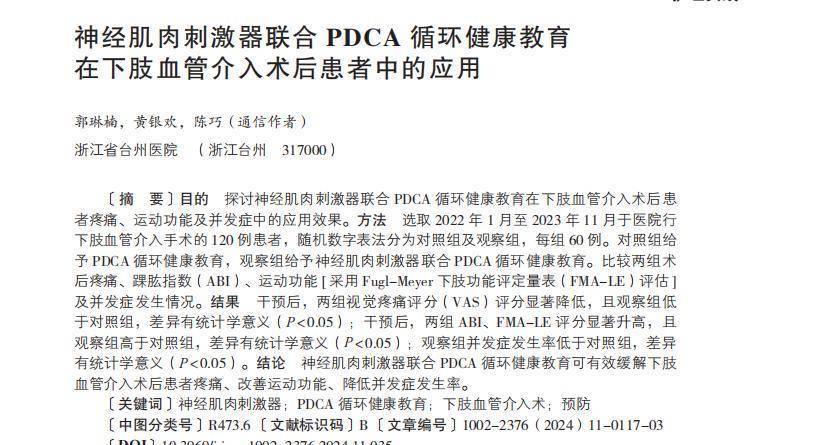 参考资料[1]郭琳楠,浙江省台州医院,神经肌肉刺激器联合 PDCA 循环健康教育在下肢血管介入术后患者中的应用,2024-06